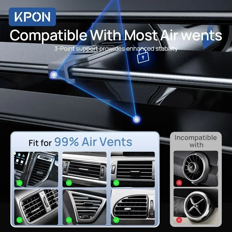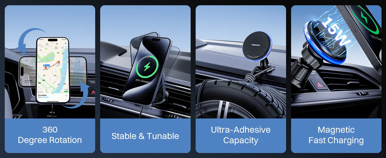 Constructed from premium materials, the wireless charging holder is built to last. Anti-slip pads protect your device from scratches, while the strong mounting mechanism ensures stability even on rough roads.